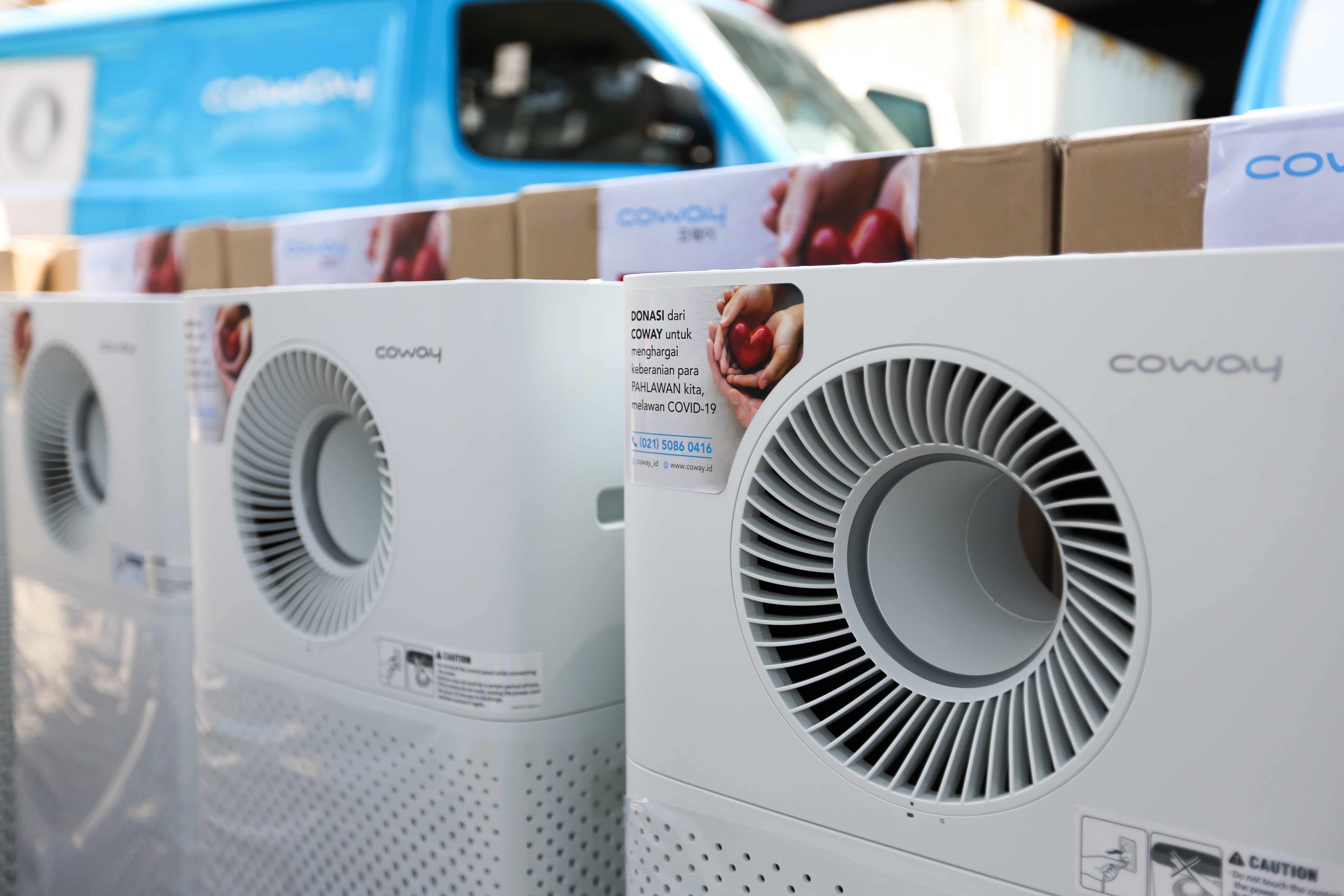 25 produk Coway Air Purifier Storm (AP-1516D) dan Breeze (AP-1018F) pada 4 rumah sakit rujukan pemerintah di Medan.